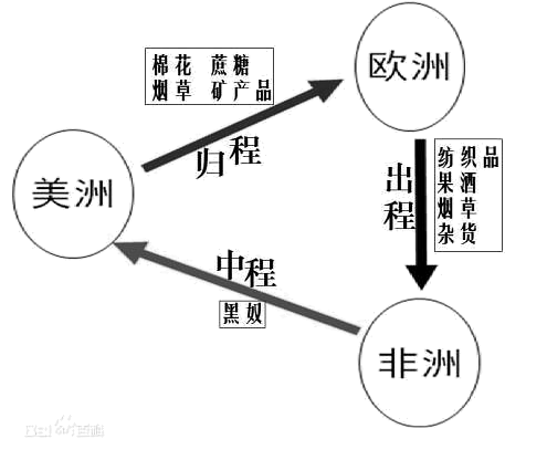 9、仔细观察下图并结合所学,可以提炼的信息是三角贸易( )A、为欧洲资本主义发展提供了大量劳动力 B、运送黑人路线和哥伦布远航的路线一致 C、是亚非地区长期贫困落后的重要根源 D、源于美洲种植园对劳动力的巨大需求