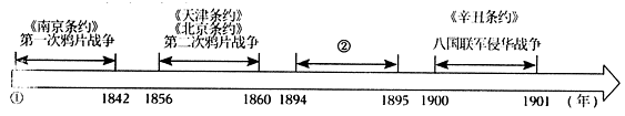 (1)材料一中的年代尺体现了近代中国的沉沦,观察年代尺中的内容示例,请你将①②两处内容补充完整,写在答题卡上。(2)哪一条约的签订是“近代中国沉沦的谷底”?结合所学,为什么说这一条约使近代中国沉沦“谷底”?材料二 是中国自由神,三民五权,推翻历史数千年专制之局。愿吾侪后死者,齐心协力,完成先生一二件未竟之功