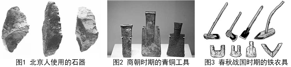 12、图1-3生产工具的演变反映出( )A、生产力的发展 B、土地私有制的确立 C、人力获得解放 D、农作物品种的增多