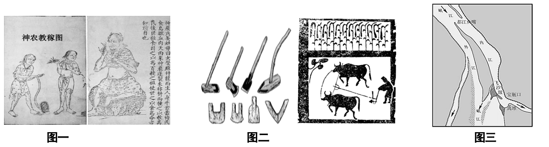 9、中国古代农业文明有着辉煌的历史。依据所学知识和下列材料回答。(1)、图一中我国古代神话传说“教民播种五谷”的是谁?“中国人和水稻打交道七八千年”,那么距今约7000年的长江流域哪一聚落居民就已种植水稻?距今约6000多年的半坡聚落居民主要种植哪种农作物?(2)、图二反映我国春秋战国时期农业生产中已普遍使用什么农具及耕作技术?其使用有何作用?(3)、图三是我国历史上哪一工程的示意图?这一工程有何作用?(4)、战国时期秦国的商鞅变法对农业生产起促进作用的措施有哪些?商鞅变法的影响是什么?
