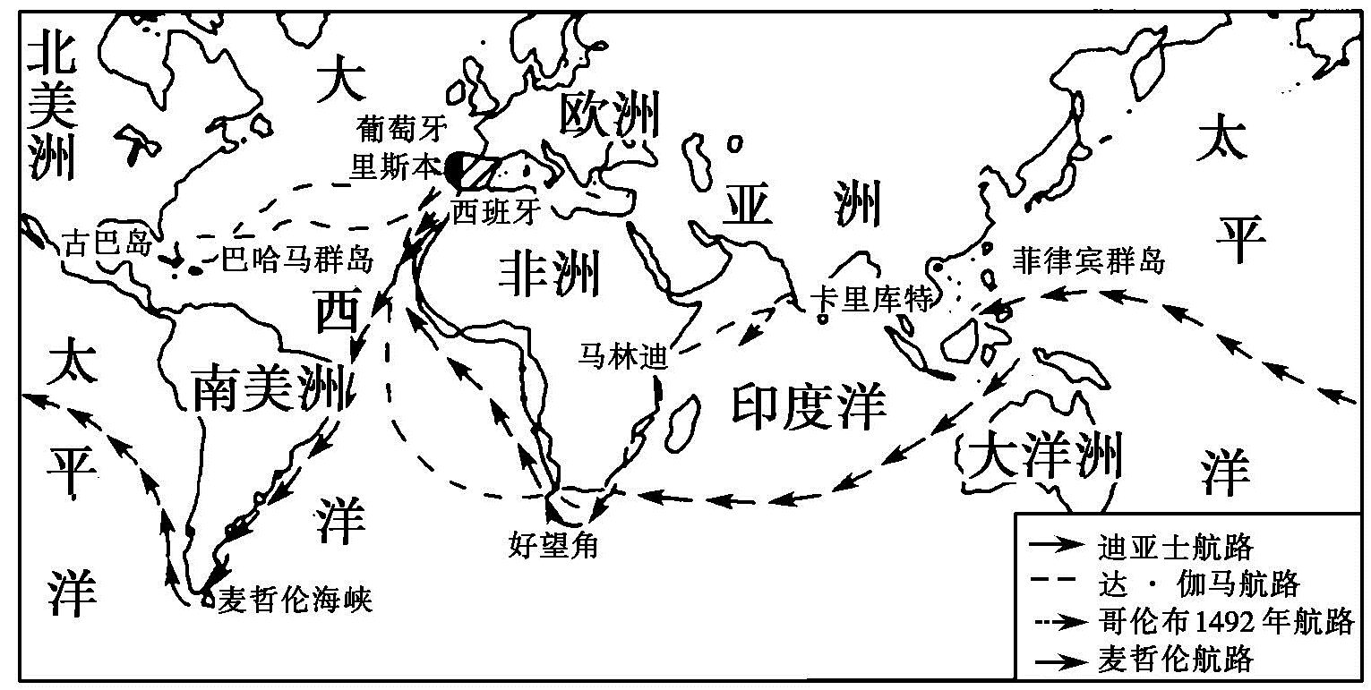 材料三 中国的指南针传入欧洲之后,海船敢于、也有条件驶入大洋深处。此外,地圆学说的日益流行,使许多人坚信从大西洋一直向西航行便能抵达东方。15、16世纪之交,西欧各国经过一系列航海探险活动,开辟了欧洲通往印度和美洲的新航路。