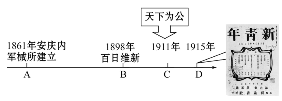10、时间轴是学习历史的重要方法之一,对下列时间轴解读正确的是( )A、在A时间,洋务派提出了“求富”口号 B、B和D爆发的运动都彻底批判儒家思想 C、C时间被确立为中华民国元年 D、该时间轴反映的主题是中国近代化的探索