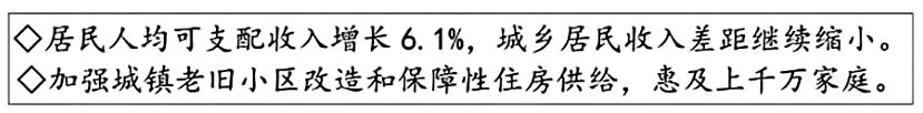 2、某班同学在准备新闻播报时,从2024年《政府工作报告》中找到以下信息。这些信息共同反映的主题是( )A、缩小城乡差距 B、保障住房供给 C、参与民主生活 D、走向共同富裕
