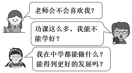 19、刚进入初中,同学们纷纷说出了自己的担忧,如下图。这反映出( )A、初中阶段给了我们自我发展的无限可能 B、初中阶段对我们的成长提出了新的要求 C、初中阶段对我们的人生具有独特的价值 D、每个人的初中生活都是非常丰富多彩的