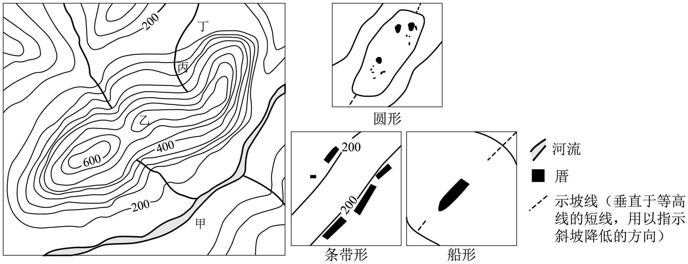 19、闽南一带称传统民居为“厝”,受地形、气候、人文、战乱等因素影响,闽南某低山丘陵区“厝”在空间组合上表现出明显的“圆形”“条带形”和“船形”三种形态。据历史学家考证,受战争影响,这三种“厝”组合形式具有明显的时间序列,且当地多数居民依然沿用北方节日习俗。下图分别为该地区等高线(单位:m)和三种“厝”空间形态示意图。据此完成下面小题。(1)、三种类型“厝”在空间布局中考虑到的共同自然要素是( )A、地形 B、气候 C、土地 D、河流(2)、“船形”厝最可能布局在左图中的( )A、甲 B、乙 C、丙 D、丁(3)、三种类型“厝”的空间组合,出现的时间序列为( )A、圆形→条带形→船形 B、圆形→船形→条带形 C、条带形→圆形→船形 D、船形→条带形→圆形