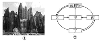 15、图①为云南路南石林,结合岩石圈物质循环简图(图②),回答下面小题。(1)、路南石林的岩石按成因分应为图②中的( )A、甲 B、乙 C、丙 D、丁(2)、塑造路南石林的主要外力作用是( )A、风力侵蚀 B、海浪侵蚀 C、流水侵蚀 D、冰川侵蚀