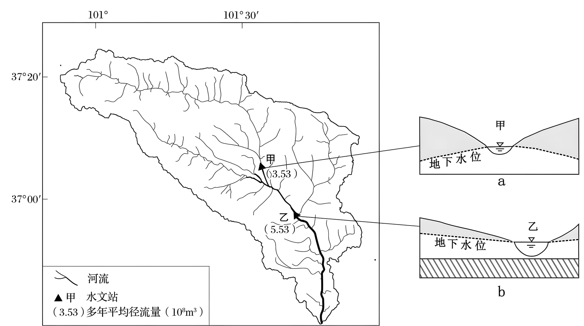 (1)、在图b中用箭头表示乙水文站河水与地下水的补给关系,并解释乙水文站径流量大于甲的原因。(2)、简析北川河流域地形对河流水文特征的影响。(3)、从水循环角度分析该流域种植小叶耐寒植被对提高地下水位的作用。 -
