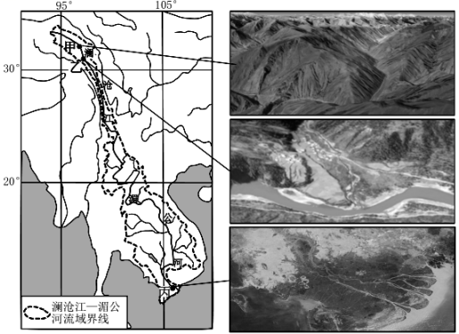 材料一:澜沧江发源于我国青藏高原,流出国境后称为湄公河。澜沧江流经横断山区时,多形成图甲处的峡谷地貌景观;在澜沧江支流汇入的地方,河流流出山口,河流摆脱了侧向约束,泥沙沉积,沉积物厚度和颗粒变化较大,形成图乙处的地貌景观;湄公河注入海洋时,流速减慢,所携带的泥沙在河口处沉积,形成图丙处的地貌景观。