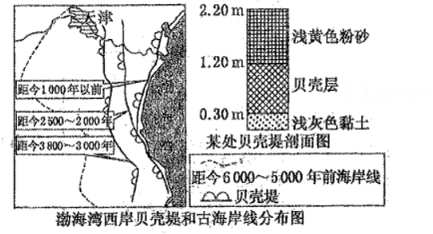 (1)、在贝壳堤的形成过程中,具体外力作用主要有哪些?(2)、请分析近6000年来渤海湾西侧海岸线的移动特征。(3)、请举例保护贝壳堤的意义。(4)、简析现今在渤海湾发展贝类养殖的有利自然条件。(5)、贝壳堤的主要化学成分是CaCO3 , 简析发展贝类养殖的环境意义。 -