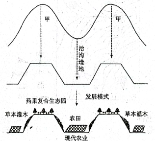 16、黄土高原丘陵沟壑区坡面整治经历了三个阶段:第一阶段为缓坡开挖梯田,旨在增加耕地面积和粮食产量,减少土壤侵蚀,但是水土流失并没有得到有效遏制;第二阶段以生态治理为核心,退耕还林还草,水土流失治理成效显著,但是对经济社会发展推动效果并不显著;第三阶段,十九大报告和中央一号文件为黄土高原丘陵沟壑区可持续振兴提供了行动指南,构建黄土高原丘陵沟壑区可持续发展模式(如下图)。据此完成问题。(1)、上图中甲的做法属于是( )A、缓坡开荒 B、山顶开荒 C、削峁建塬 D、打坝淤地(2)、在边坡地带选择种草本灌木,不选择种植果树的主要原因有( )