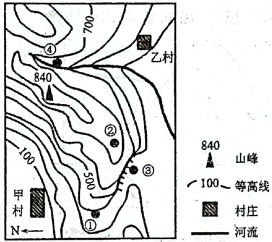 3、下图为我国某地等高线地形图(单位:m)。据此完成问题。(1)、图示地区( )A、平原主要分布在西北部 B、河流先向东流再流向东南 C、最高处为山峰所在地: D、甲、乙两村的高差约为280m(2)、图中①、②、③、④四地中( )A、①地发生山洪的几率最大 B、②地可以看到山峰和乙村 C、③地能欣赏到壮观的瀑布一 D、④地最适合夏季夜晚露营