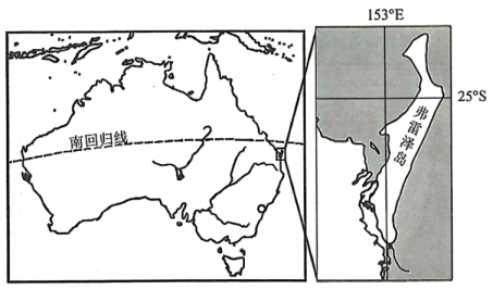 2020年12月初,苏杨老师到弗雷泽岛进行为期一个月的交流活动,她被该岛的美丽景色深深吸引,移动的沙丘、清澈的海湾和白色海滩,构成了这个岛屿独一无二的景观。后来查阅资料发现:弗雷泽岛是世界上最大的沙岛,形成年代久远,约1500毫米年降雨量使沙地上生长着雨林植物。下图示意弗雷泽岛地理位置。