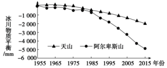 15、冰川物质平衡是单位时间内冰川以固态降水为主的物质收入和以冰消融为主的物质支出的代数和。天山山脉和阿尔卑斯山脉都是世界上典型的山岳冰川分布区,前者冰温(℃)恒为负,后者接近0℃,下表为两山区代表性冰川物质平衡情况,下图表示两山区冰川累积物质平衡年际变化。据此完成下面小题。
