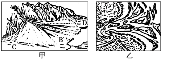 6、读图,完成下列问题。(1)、若河流流出山口,则在山口处常形成的地貌是 , 对应(图甲或图乙);若河流注入海洋,则在入海口处形成的地貌是 , 对应(图甲或图乙)。以上两种地貌都属于河流(填沉积或侵蚀)地貌。(2)、图甲所示地貌的沉积物从扇顶到扇缘,地面坡度逐渐 , 堆积物颗粒由到。