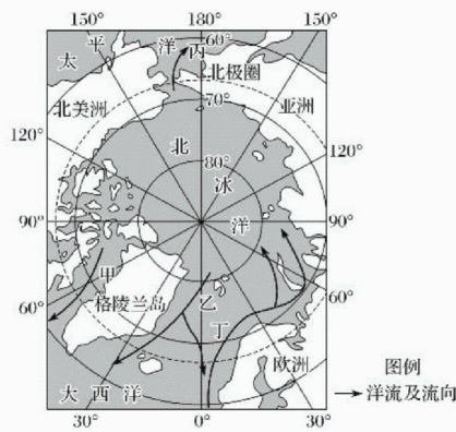 (1)、指出丁洋流的性质,并简述其对沿岸地区地理环境产生的影响。(2)、说明北冰洋海冰融化对该海域洋流产生的影响。