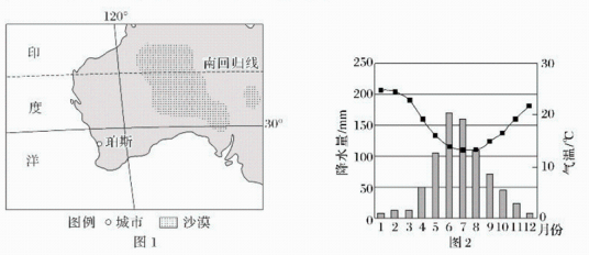 珀斯是一个多风的城市,夏季以微风为主,一天中风向多变;冬季风力强劲。下面图1为珀斯地理位置示意图,图2为珀斯气候资料图。