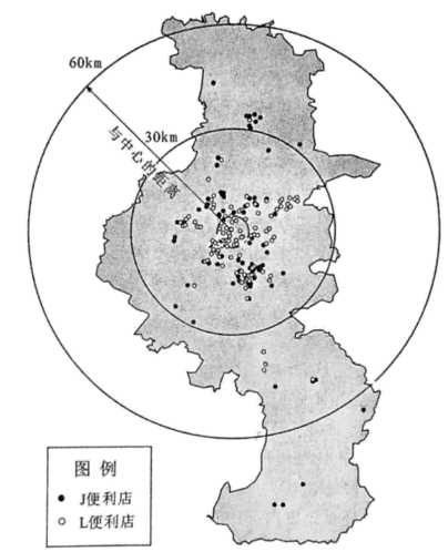 2、下图为某特大城市市域范围内两类典型连锁便利店空间分布图。L便利店以传统线下销售为主,J便利店既可以满足顾客线下购物需求,也可线上购物后通过自营物流进行商品配送。两类便利店单个店铺面积及销售商品种类相似。据此,完成下面小题。(1)、与郊区的单个门店相比,推测中心城区L连锁便利店的单个门店平均( )A、货品种类更少 B、营业面积更大 C、消费人数更少 D、营业时间更长(2)、与L传统连锁便利店相比,J便利店整体( )A、地租水平较低 B、线下消费更多 C、交通优势明显 D、服务半径较小(3)、在该城市,J便利店快速发展主要得益于( )