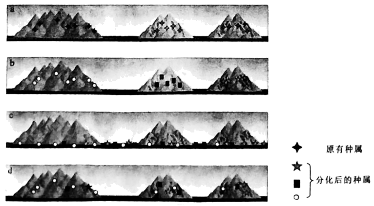 3、高海拔生境下生物长期被孤立山峰分割或隔离易出现种群分化,从而演化出大量特有种属的生物,被称为天空岛现象。高山垫柳为横断山区约4000m海拔寒带植物群落的主要组成部分,具有匍匐茎与侧枝,高度不超过5cm。下图为横断山区某类高山垫柳分布的天空岛环境及种群分化顺序示意图,研究时期无较明显的地壳运动。据此,完成下面小题。(1)、推测该地区高山垫柳所属主要植被类型是( )A、高寒荒漠 B、高山灌丛 C、高山针叶林 D、落叶阔叶林(2)、a→b过程中,同一种群高山垫柳发生规模分化的原因是( )