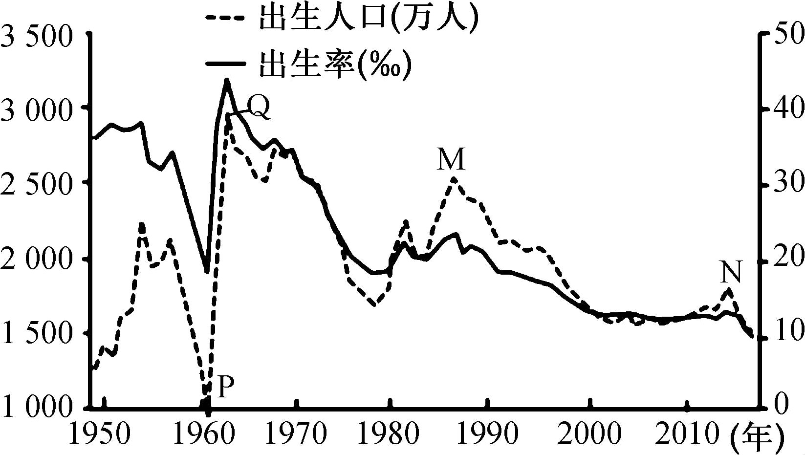 14、读我国1949~2019年人口的增长状况示意图,完成下面小题。(1)、与P“谷值”关联性最强的是( )A、劳动力短缺 B、老龄化严重 C、经济增速减慢 D、经济增速加快(2)、导致M“峰值”出现的主要原因是( )A、Q“峰值”产生的影响 B、改革开放的影响 C、计划生育政策的调整 D、生育观念的转变(3)、N“峰值”明显小于预期值的主要原因是( )A、严格的生育政策 B、生育观念的转变 C、两孩政策的实施 D、婚育人口的减少