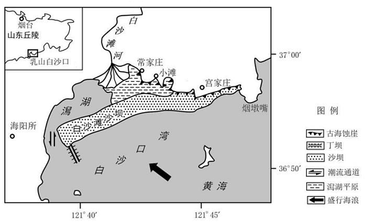 据研究,山东乳山市白沙口湾水深约2米,因第四纪冰期后期气候转暖,被黄海海水浸没而成,并在基岩海岸发育了古海蚀崖。距今约5~1万年前,该海湾形成了东西延伸的白沙滩沙坝,潟湖也随之形成。在潟湖北部,白沙滩河每年携带泥沙输入,但其输沙量季节差异大。1984年,为阻挡东来的沿岸泥沙淤积堵塞潮流通道,于是顺着潟湖出口修建了350米长的丁坝。下图为白沙口海岸地貌简图。