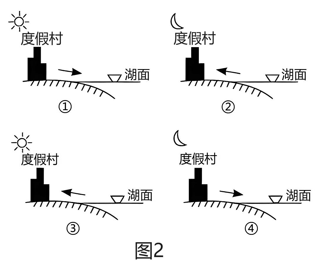 10、图1是“湖州南太湖某度假村景观图”,图2示意“太湖与度假村之间近地面风向”。读图完成下面小题。(1)、图2中能正确反映太湖与度假村之间近地面风向的是( )A、①② B、③④ C、②③ D、①④(2)、造成度假村近地面风向昼夜变化的原因是( )A、太阳辐射不同 B、人为原因 C、地势起伏不同 D、地表物质不同