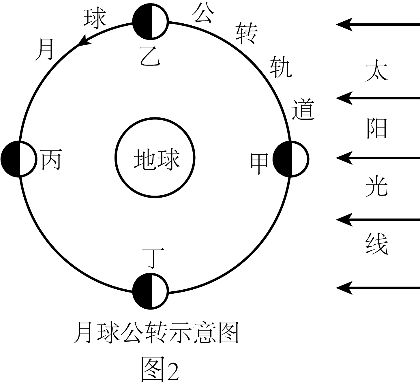 16、2024年9月17日,中秋佳节,月亮是当之无愧的主角,一位苏州摄影爱好者朋友圈晒出一张绝美“大片”,满月、虎丘塔、东方之门同框,历史与现代在中秋月夜下完美融合。图1为满月、虎丘塔、东方之门同框照片,图2为月球公转示意图。读图完成下面小题。(1)、当观察到上述月相时,月球位于月球公转示意图的位置是( )A、甲 B、乙 C、丙 D、丁(2)、下图示意我们经常见到的四种月相。在一个朔望月内,按月相出现的时间先后排序正确的是( )A、①②④③ B、②④③① C、②①③④ D、①③④②