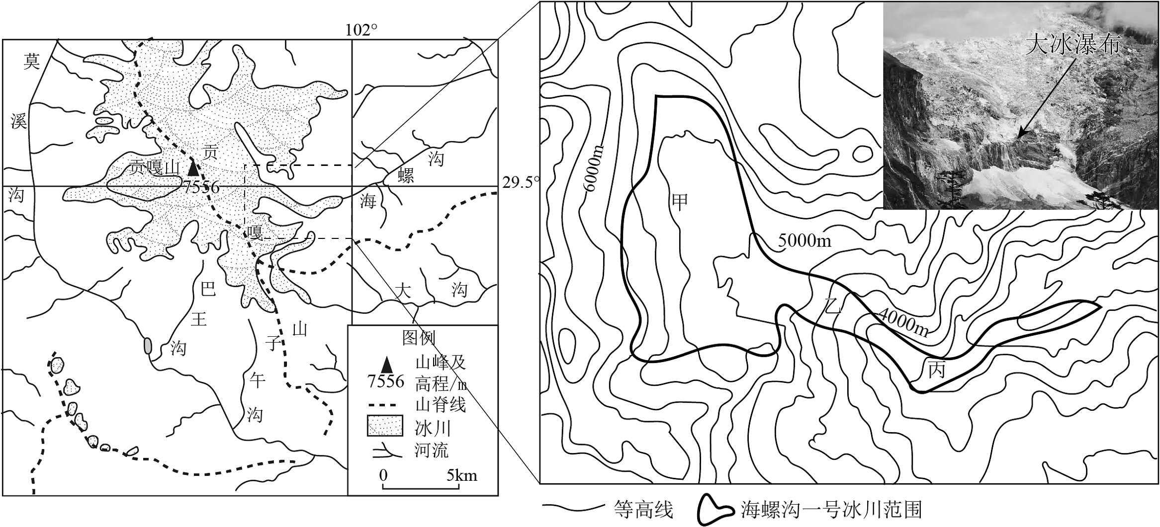 材料三:图是海螺沟位置和等高线地形图。