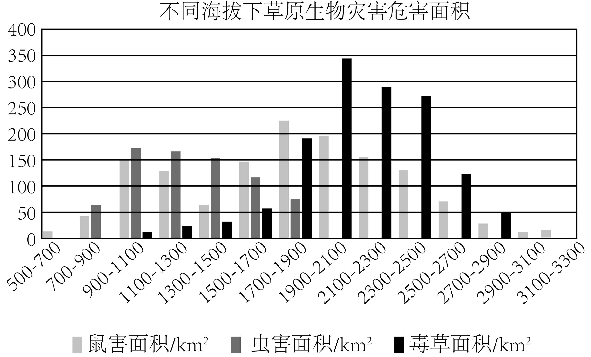 A、①③ B、①④ C、②③ D、②④(2)、影响1300—1500m之间生物灾害危害总面积相对较少的主要原因可能是( )A、海拔 B、坡度 C、坡向 D、光照(3)、关于伊犁草原生物灾害危害面积分布特点与成因说法正确的是( )①鼠害:较低海拔极少——人工干预影响增强