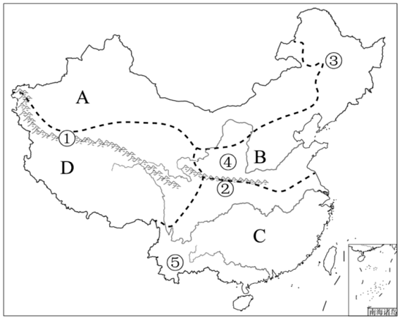 13、下图为我国四大地理区域图。据此完成下面小题。(1)、下列地点所属四大地理区域判断正确的( )A、③点—东北地区 B、②点—南方地区 C、④点—西北地区 D、①点—北方地区(2)、关于四大地理区域及界线的说法,正确的( )A、①山脉既是第二、三阶梯界线,又是区域界线 B、②山脉和淮河是南方和北方的分界线 C、③线与800毫米年等降水量线大体一致 D、⑤所在的高原地面平坦,一望无垠