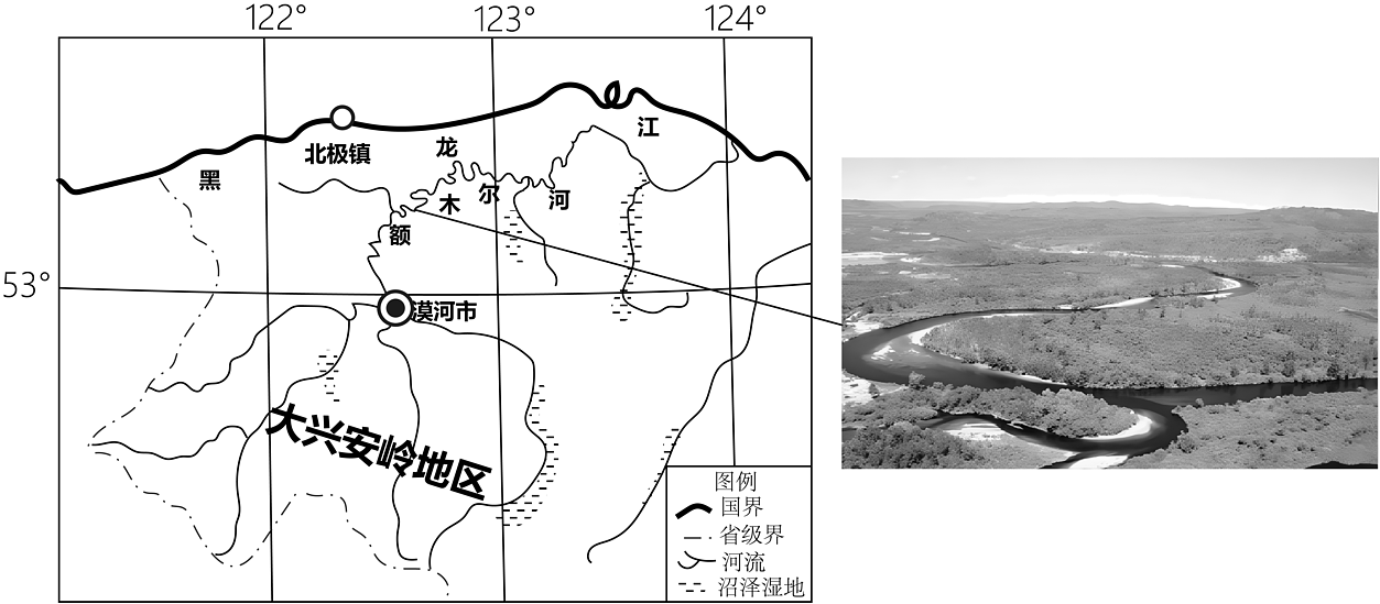研究表明,与100年前相比,东北地区多年冻土南界已北移20~30km,漠河地区多年冻土持续退化,在山体斜坡和相对较高地区,冻土的融深加大,大量融水向低洼地区聚集,改变了湿地的分布,破坏了植被的生长环境,并影响全球碳循环过程。下图示意漠河市位置、地形、河流与湿地分布和额木尔河某河段景观。
