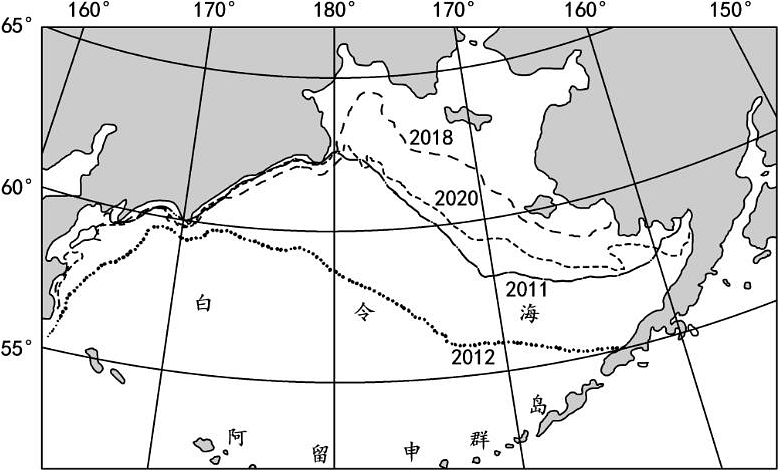 材料二下图为2011年、2012年、2018年和2020年白令海海冰外缘线示意图。