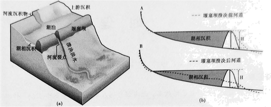 堰塞是指滑坡、冰碛和火山熔岩等物质阻塞河道形成堰塞湖,随后堰塞湖溃决直至消亡的过程。河流纵剖面在均衡的条件下整体呈现为相对平滑的下凹曲线形态,一旦发生堰塞,平衡被打破则易形成相对原河床异常凸出部位即裂点。研究表明青藏高原的平坦高原面完整性与堰塞裂点有关。图a为堰塞作用示意图。图b为堰塞坝溃决前后河流纵剖面变化示意图。