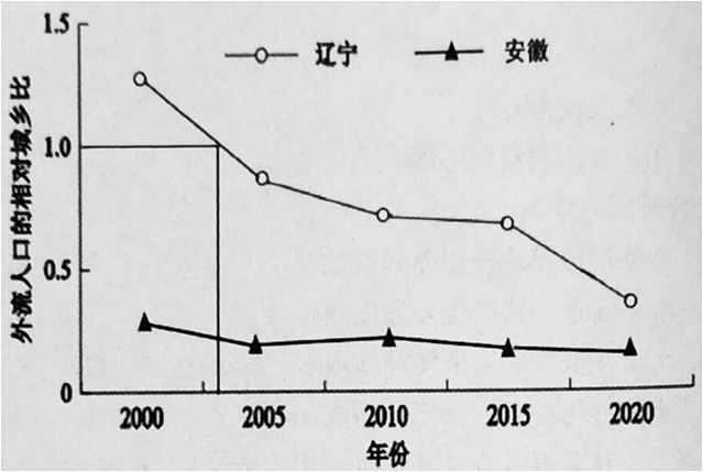 5、外流人口的相对城乡比即外流人口城乡比与常住人口城乡比的比值,等价于城镇人口和乡村人口的外流率之比。研究表明,21世纪以来我国东北地区与中部地区人口迁移有明显差异,下图为辽宁、安徽两省2000~2020年外流人口的相对城乡比。据此完成下面小题。(1)、辽宁2003年外流人口的相对城乡比为1.0,说明当年该省( )A、流出人口和流入人口形成动态相对平衡 B、流入到城镇和乡村的人口数量大致相同 C、从城镇和乡村流出的人口数量大致相同 D、城镇和乡村人口具有同等意愿外流倾向(2)、据上图可知,相比安徽21世纪以来辽宁( )A、人口流出数量相对较多 B、人口外流率下降速度快 C、城镇吸引力相对不足 D、城乡一体化程度较低