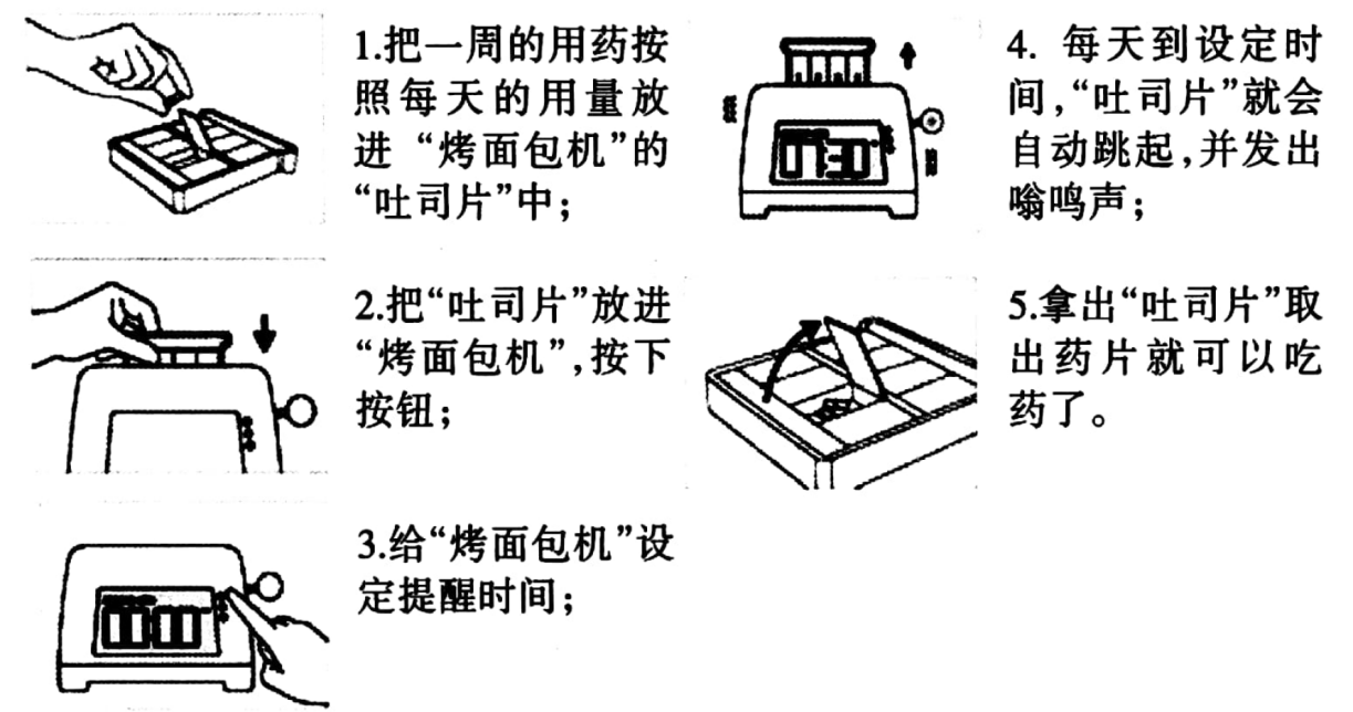 老年人往往多病共体,用药种类和频率提高,但视力、记忆减弱,因此甲公司推出“烤面包机药盒”(如图)。其灵感来自烤面包机,该发明一投入市场,就广受好评。