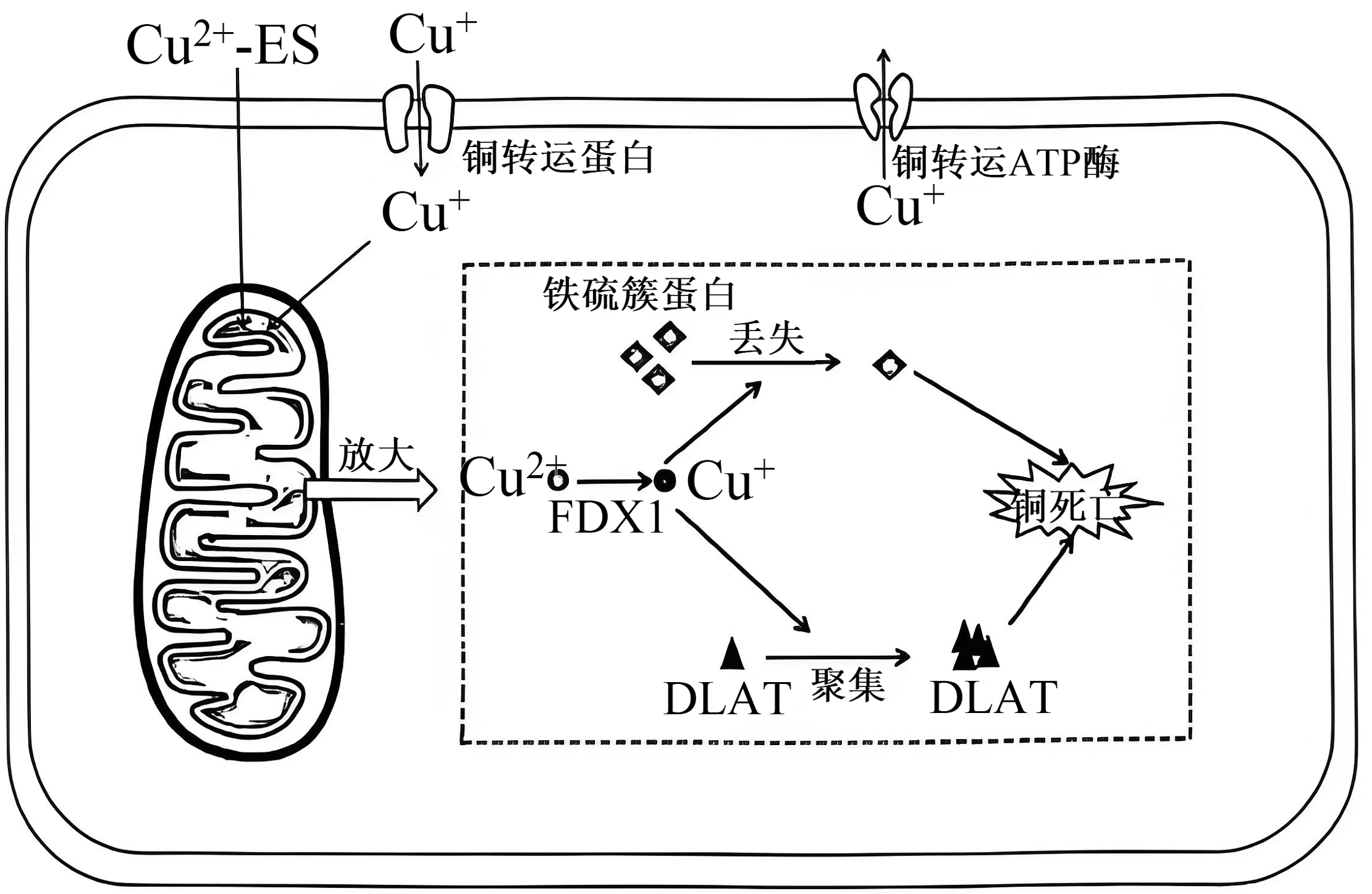 注:ES是一种人工合成的铜离子载体药物。FDX1是一种酶,其含量受FDX1基因的调控。铁硫簇蛋白和DLAT在线粒体内的有氧呼吸过程中具有重要作用。