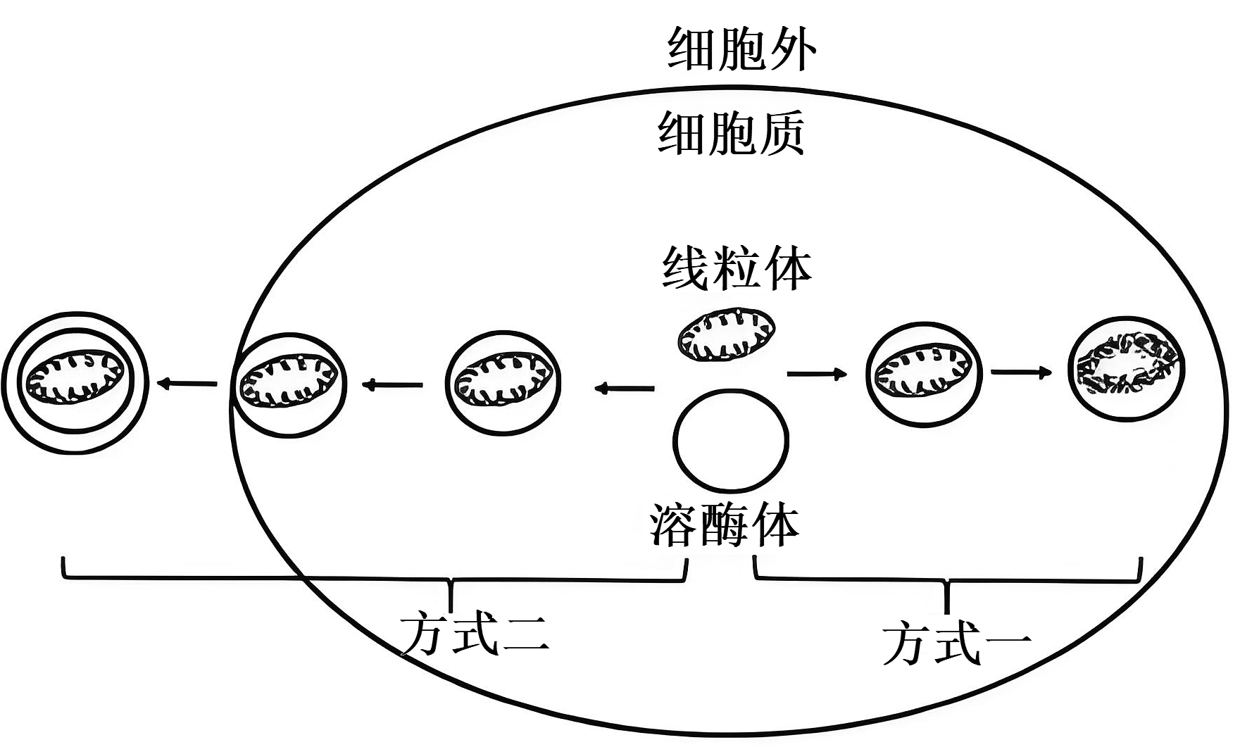 10、帕金森症(PD)是一种与衰老相关的神经退行性综合征,线粒体数量减少是PD的典型特征。通常情况下,线粒体被溶酶体降解(图方式一)是导致PD的重要病因。最近,我国科学家发现药物氟桂利嗪引起的大脑细胞中线粒体减少(图方式二),是诱发PD的新机制。下列叙述错误的是( )A、神经细胞中线粒体可为神经递质的合成和分泌提供能量 B、方式一属于细胞自噬,细胞自噬对细胞和个体都是有害的 C、氟桂利嗪会导致溶酶体包裹线粒体,并将线粒体运出细胞 D、氟桂利嗪处理可获得去除线粒体的真核细胞模型