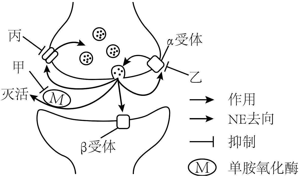 3、药物甲、乙、丙均可治疗某种疾病,其相关作用机制如图所示。突触前膜释放的递质为去甲肾上腺素(NE),单胺氧化酶能氧化NE,药物甲能抑制单胺氧化酶的活性。下列说法错误的是( )A、药物甲的作用可导致突触间隙中的NE增多 B、图中a受体和β受体的分子结构不同 C、NE 与β受体结合体现了膜的选择透过性 D、药物丙的作用可导致突触间隙中的NE增多