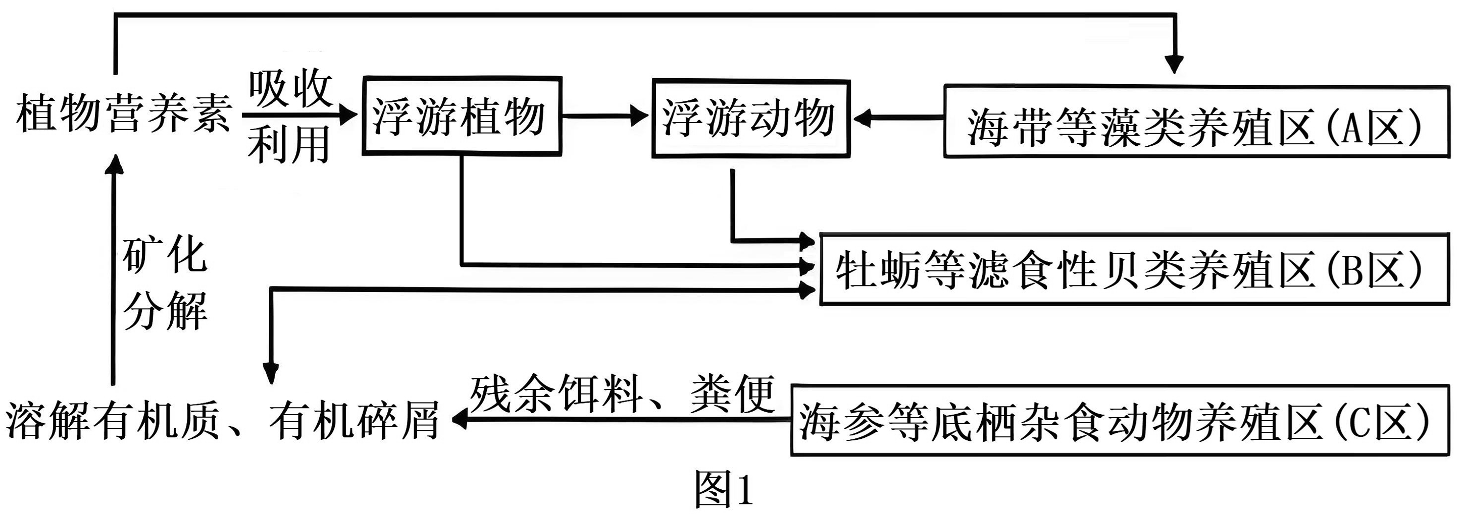19、海水立体养殖中,表层养殖海带等大型藻类,海带下面挂笼养殖滤食小型浮游植物的牡蛎,底层养殖以底栖微藻、生物遗体残骸等为食的海参,如图1所示。某海水立体养殖生态系统的能量流动示意图如图2[单位:kJ/(m2·a)],M、N表示营养级。回答下列问题。(1)、养殖的海带数量过多会造成牡蛎减产,从生物群落的角度分析,原因是。(2)、图2中M用于生长、发育和繁殖的能量为kJ/(m2·a)。由M到N的能量传递效率为%(保留一位小数)。(3)、为研究该生态系统对海洋环境的影响,科研人员调查了对照区、A、B、C区中浮游动物的总丰富度(与环境的优劣呈正相关)及海水中无机氮、活性磷酸盐含量,结果如图3。