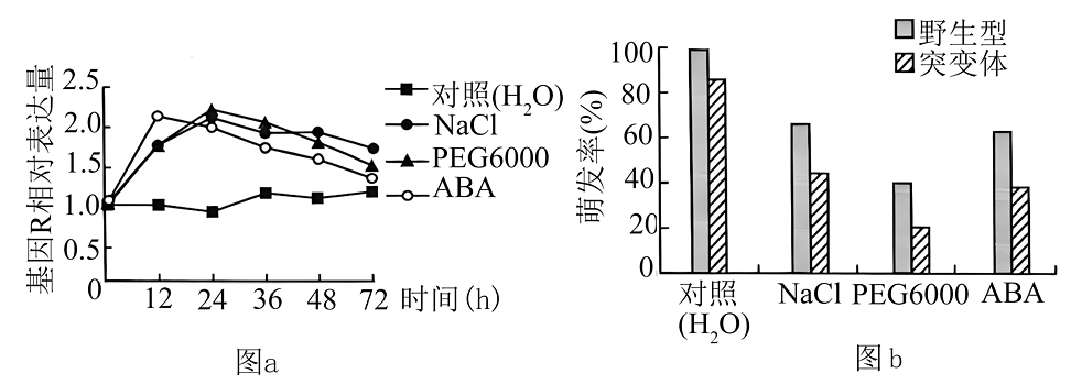 • 5、脱落酸(ABA)是植物响应逆境胁迫的信号分子,NaCl和PEG6000(PEG6000不能进入细胞)皆可引起渗透胁迫。图a为某水稻种子在不同处理下基因R的相对表达量变化,图b为该基因的突变体和野生型种子在不同处理下7天时的萌发率。研究还发现无论在正常还是逆境下,基因R的突变体种子中ABA含量皆高于野生型。下列叙述错误的是(  )