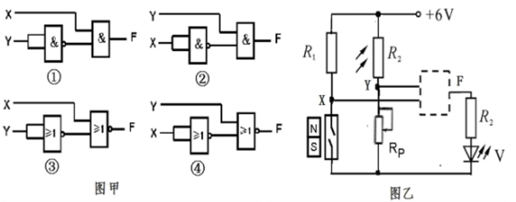 5、学了电子控制技术后,小杨和小明打算在各自的家门上安装门控夜明灯电路,实现光线暗时打开门,灯自动点亮,光线亮时,即使门打开,灯也不会亮。小明通过逻辑门电路来实现以上功能,电路如图乙所示,虚线框内尚缺逻辑电路部分。有如图甲所示4个组合,小明可以选用的电路是( )A、①或③ B、①或④ C、②或③ D、②或④