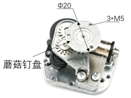 3、小明计划为即将到来的校运会设计制作一个八音盒纪念品——奔跑的舟中人。小明为此买来了一个八音盒机芯(图1)该机芯在发出音乐的同时顶部的蘑菇钉会逆时针以每分钟5圈的速度转动,小明想通过旋转功能带动奔跑的小人(图2)在面板上沿着椭圆形的跑道槽转圈(宽度为6mm,如图3)奔跑,蘑菇钉圆盘上有3个M5的螺纹孔用于连接,奔跑的小人下方固定有直径为5mm,高15mm的木制圆柱,请你帮助小明设计该装置的机械部分,设计要求如下:
