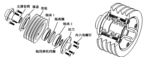 20、如图所示是一种皮带轮的结构示意图。端盖通过内六角螺钉安装在带轮上,用于轴承在带轮孔内的轴向定位;轴承1、隔离圈和轴承2分别安装在带轮的孔内;支撑套筒从端盖孔中穿过与轴承1、轴承2的内圈配合,并用轴用弹性挡圈固定;法兰通过内六角螺钉安装在带轮上,将轴承固定在带轮孔内。该结构的装配需要以下环节:A .安装轴承1;B .安装端盖;C .安装轴用弹性挡圈;D .安装轴承2;E .安装隔离圈;F .安装支撑套筒;G .安装法兰。请分析该结构和装配工艺,回答以下问题:(1)、合理的装配流程为:B→→→D→→C→(在横线处填写装配环节的序号);(2)、拧紧内六角螺钉,所用的工具是 (在下列选项中选择合适的选项,将序号填入横线处);A、