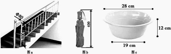 15、小明发现下雨天雨伞放地上,水会打湿地面;他想在家里的楼梯扶手(如图a所示)上设计一个架子用于挂湿漉漉的雨伞,雨伞的长度如图b所示,架子底部放置一个如图c所示的塑料盆,用于接雨伞滴下来的水。