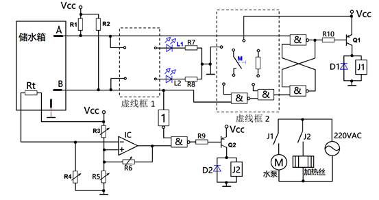 9、传统的太阳能热水器遇到连续阴雨天,会出现无热水可用的问题。如图是小明设计的带加热功能的太阳能水位控制电路,探头A、B用于检测储水箱水位,当水位低于探头B,水泵工作上水;当水位高于探头A时,水泵停止工作。负温度系数热敏电阻Rt用于检测储水箱温度,水温低于下限温度时,加热丝开始加热,直到水温高于上限温度。请你完成下列各题。(1)、当水箱水位低于探头B,温度低于下限温度,三极管Q2的状态为(在①截止;②放大;③饱和;④不确定中选择合适的选项,将序号填入横线处)(2)、调试时,小明将某一个可变电阻调大,发现上限温度变低,下限温度变高。该电阻是(在①R3;②R4;③R5;④R6中选择合适的选项,将序号填入横线处)(3)、该电路缺少水位指示电路,请你根据表1的功能,在虚线框1中用两个与非门连线,实现水位指示灯电路。(4)、该电路手动上水功能未设计完整,请你在虚线框2中选择合适的端点连线,实现只要水位在A以下,按一下按键开关M(按下闭合,松手断开),水泵也能工作上水。