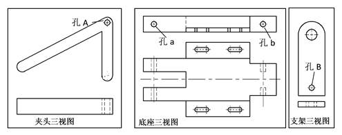 (1)、夹头向下压紧工件后,手柄停止旋进。此时夹头的主要受力形式为、丝杆的主要受力形式为(在①受拉;②受压;③受弯曲;④受剪切;⑤受扭转中选择合适的序号,将序号填入横线处)。(2)、图2为夹头、底座、支架的三视图,根据三视图中的信息,则底座的孔a和夹头孔A,可以加工内螺纹的是(在①底座孔a;②夹头孔A中选择合适的序号,将序号填入横线处);底座孔b和支架孔B,需要加工内螺纹的是(在①底座孔b;②支架孔B中选择合适的序号,将序号填入横线处)。图2