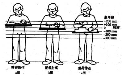 2、作业性质是确定站姿或坐姿状态下作业面高度的重要依据。如图所示的站姿作业中,适合木工凿削作业的工作台是( )A、a图 B、b图 C、c图 D、都可以