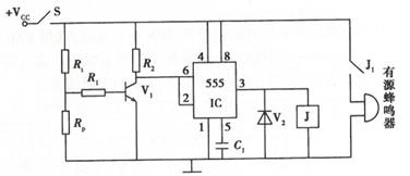 3、【加试题】如图是小明设计的高温报警器电路原理图,当温度达到或超过设定值时,蜂鸣器发出报警声。555集成电路的输入输出特性:2脚的电位低于Vcc。的三分之一时,3脚输出高电平;2脚电位高于Vcc的三分之一,且6脚电位高于Vcc的三分之二时,3脚输出低电平。请根据描述和电路图完成以下任务:(1)、根据电路功能要求,R1应选择(在A .正温度系数热敏电阻;B .负温度系数热敏电阻中选择正确的一项填入横线中);(2)、在测试电路时,小明用万用表测得三极管V1的集电极和发射极之间的电压是0.2V,此时三极管V1处于状态(在A .截止; B .放大; C .饱和中选择正确的一项)(3)、小明测试电路时,发现蜂鸣器始终不响,下列原因中可能的是(在A .三极管V1被击穿后短路; B .二极管V2虚焊; C .电阻Rp短路中选择正确的一项填入横线中);(4)、小明测试电路时,发现温度还未达到设定温度时就已经报警,为了实现设定温度报警,则可以(在A .减小R1;B .调小Rp;C .调大Rp中选择正确的一项填入横线中);(5)、在测试过程中,小明将555集成电路损坏,准备用三极管来代替。请你帮助小明选择一个合适的三极管(NPN型或PNP型),采用共发射极接法在如图所示的虚线框中画出三极管,并选择合适的接线端完成电路的连线,要求保持电路原有的功能。