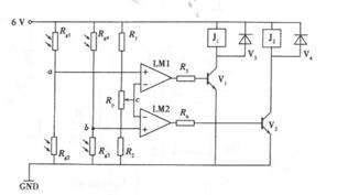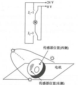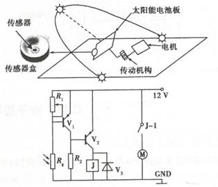 7、【加试题】目前,多数太阳能电池发电板都是固定安装的,导致太阳能利用不充分,为此小明设计了太阳能跟踪系统,如图所示,其原理是当光线与电池板不垂直时,传感器盒内的光敏电阻接收到光线变化,从而控制电机转动,实现跟踪。请根据电路原理和描述完成以下任务:(1)、当太阳向西斜,传感器接收到的光较弱,三极管的状态是(在A .V1导通、V2截止;B .V1导通、V2导通;C .V1截止、V2截止;D.V1截止、V2导通中选择合适的选项,将序号填写在横线处),电机带动太阳能电池板向西转动;(2)、乌云突然飘过挡住光,则三极管V,集电极的电位将(在A .升高;B .降低;C .基本不变中选择合适的选项,将序号填写在横线处),导致太阳能电池板跟踪受到干扰。(3)、为了解决上述干扰问题,小明重新设计了电路和传感器盒,如图所示,电路中用四个光敏电阻,分别装在传感器盒内的东西两侧。当太阳自东向西运动时,东侧光敏电阻接收到的光增强。当电流从上往下流过电机时,电机正转,太阳能电池板向西运动。(LM1和LM2的特性关系是:V+>V_时,输出高电平;V+<V_时,输出低电平。)