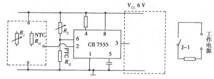 6、小明设计一个热带鱼鱼缸水温控制器,控温要求23~27℃,由于器材短缺,需要克服许多问题,请你来试试。(1)、小明的手上只有两只实验用的热敏电阻,一只PTC正温度系数,-只NTC负温度系数;他使用的继电器工作电压为4.5V,吸合电压为3.5V,吸合电流为20mA;用555芯片控制,功能参数如图,请你根据芯片逻辑功能,完成虚线框中电路连接。