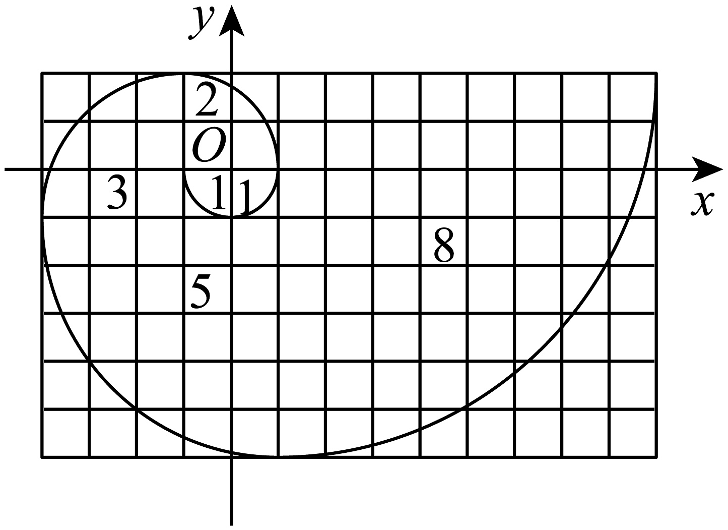 7、人教A版选择性必修二教材的封面图案是斐波那契螺旋线,它被誉为自然界最完美的“黄金螺旋”,自然界存在很多斐波那契螺旋线的图案,例如向日葵、鹦鹉螺等.斐波那契螺旋线的画法是:以斐波那契数1,1,2,3,5,8,…为边长的正方形拼成长方形,然后在每个正方形中画一个圆心角为90°的圆弧,这些圆弧所连起来的弧线就是斐波那契螺旋线.下图为该螺旋线在正方形边长为1,1,2,3,5,8的部分,如图建立平面直角坐标系(规定小方格的边长为1),则接下来的一段圆弧所在圆的方程为( ).A、 B、 C、 D、
